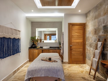 The full-service spa offers daily treatments in couples rooms and outdoor areas. A private hot tub, sauna, and garden create the perfect wellness retreat.