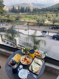 Beautiful location with a balcony the looks over the mountainside. Staff was kind and welcoming. Breakfast served in suite with many options. Stayed over Easter weekend and they brought is traditional Easter Bread and Honey. Blackout shades and comfortable bed made the room perfect for sleeping in. Kitchenette was well stocked and fridge made all our beverages frosty cold. Would definitely recommend!